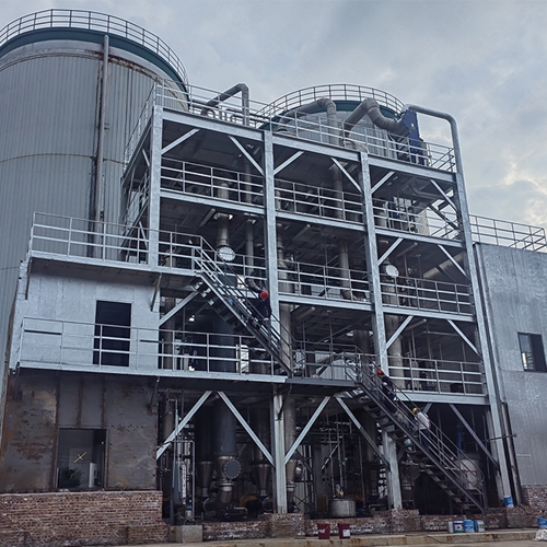 氯化鈣液體原料液經預熱器進入降膜蒸發器。原料液自降膜蒸發器加熱室上管箱加入,經分布器,在換熱管內均勻分布,在重力和真空誘導及氣流的作用下,形成均勻膜狀流體自上而下流動。